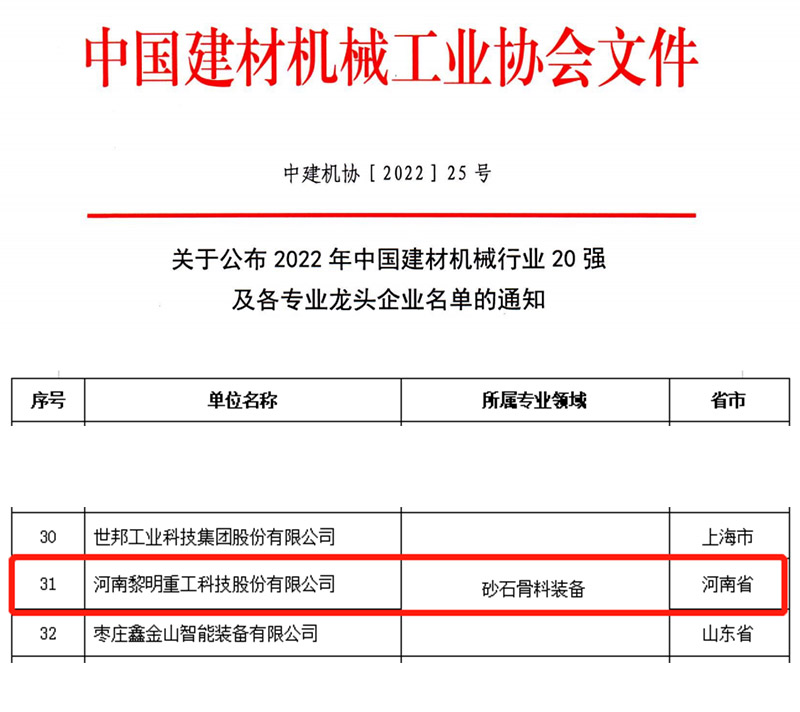 2022年10月18日,中國建材機械工業(yè)協(xié)會公布了2022年中國建材機械行業(yè)20強及各專門龍頭企業(yè)名單。根據(jù)《中國建材機械行業(yè)20強及專門龍頭企業(yè)管理辦法》的規(guī)定,此榜單是按企業(yè)2021年度建材機械產(chǎn)品銷售收入排序確定的,黎明重工入選砂石骨料裝備龍頭企業(yè)名單。