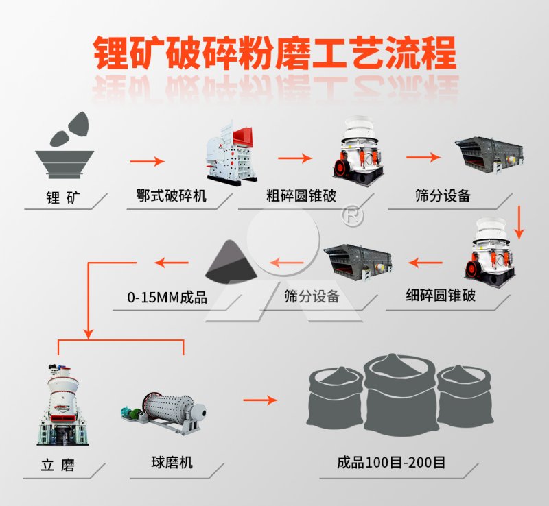 鋰礦破碎制粉生產(chǎn)線我們推舉使用設(shè)備包括有顎式破碎機(jī)、粗、細(xì)碎圓錐破碎機(jī)、立式磨以及配套設(shè)備振動篩。鋰礦石開采后,由于礦石大小不一,首先要經(jīng)過顎式破碎機(jī)進(jìn)行初破,出料送入粗碎圓錐破碎機(jī)進(jìn)一步破碎,之后通過振動篩篩分出合格物料進(jìn)行細(xì)碎圓錐破碎機(jī)的粉碎,得到適合的出料經(jīng)篩分后送入球磨機(jī)或者立式磨進(jìn)行粉磨加工,之后就可以提煉鋰精礦和制備碳酸鋰。